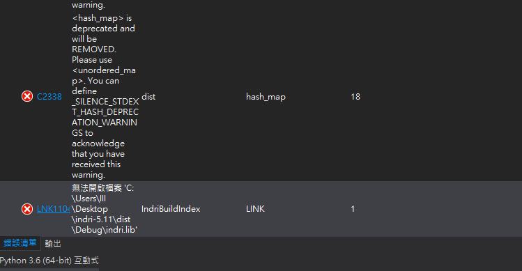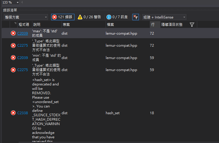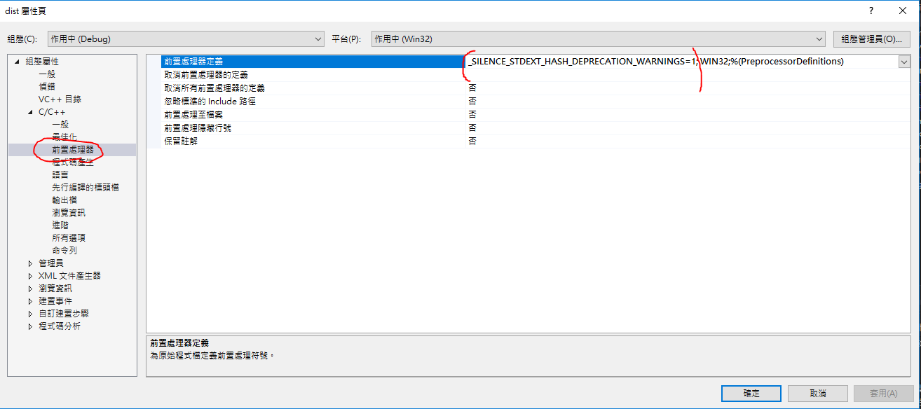 In the Program Manager window: Right click dist >property >c++ >preprocessor definition> add “_SILENCE_STDEXT_HASH_DEPRECATION_WARNINGS=1;” befor all words.