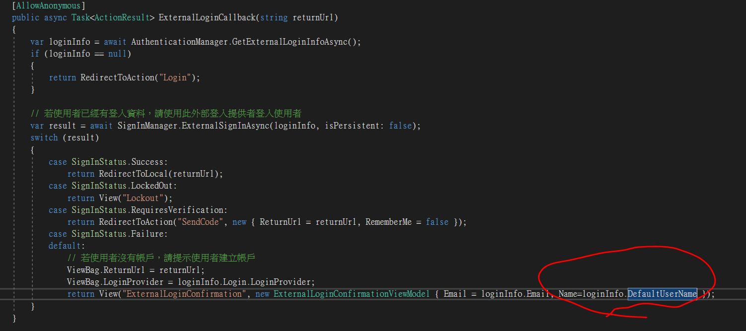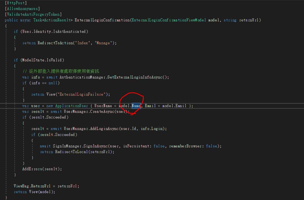 return View("ExternalLoginConfirmation", new ExternalLoginConfirmationViewModel { Email = loginInfo.Email, Name=loginInfo.DefaultUserName });