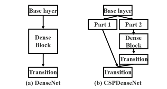 在結構上,Base layer會被切分成part1與part2,個別擁有Base layer中channel數的1/2,part2經過Dense Block與Transition layer後直接與Part1疊合(concatenate)在一起,論文中還有討論到截斷(truncating)重複傳遞梯度的好處,以及透過調整transition layer的位置來實踐的方式,不過在yolov4跟後面模型的實作上提及不多,這邊就不多做介紹了。
