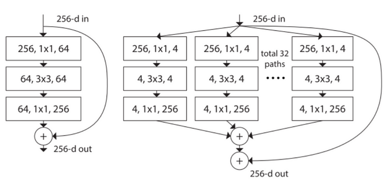 將原本ResNet中的residual block(下圖左)改成透過多個卷積通道(Path,也稱branch、cardinality或group)疊合(concatenate)的block(下圖右),增加模型的學習能力。而這樣的通道亦被作者從新定義為一般卷積層在設定時的一個參數Cardinality。ResNext也是CNN領域中重要的發展,ResNext讓模型大小的比較從只有深度,轉移到深度與寬度。