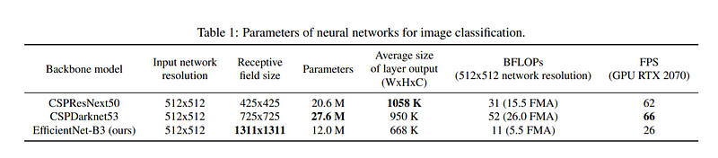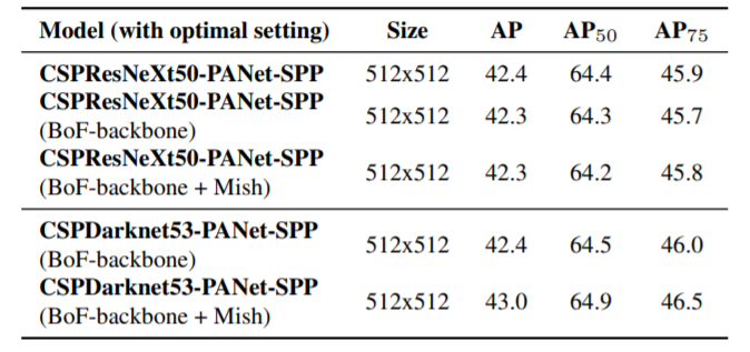 使用上,CSPNet可以跟不同的Backbone架構結合。在原始論文中有被比較的就有CSPResNet、CSPResNext、CSPDarknet…等等。而在yolov4的論文中,作者比較了CSPResNext50與為了物件偵測設計的CSPdarknet53後,發現雖然CSPResNext的Receptive Field較大(見下圖,Hypothetically speaking, we can assume that a model with a larger receptive field size and a larger number of parameters should be selected as the backbone.),但是從AP來看,在總體表現上成長性卻不如CSPdarknet53(We observe that the CSPDarknet53 model demonstrates a greater ability to increase the detector accuracy owing to various improvements.)。