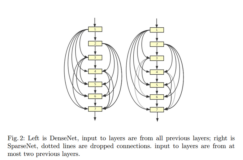 SparseNet是DenseNet的修正版本,畢竟把前面所有卷積層的疊加起來做為下一層的輸入太過極端,一方面一層一層之間損失的資訊量沒那麼大,真的沒有必要讓每一層的從新計算過去每一層與正確答案之間的關聯性。另一面,這麼做對運算效能也會產生極大的壓力。因此,SparseNet的作者便開始想方設法,讓DenseNet可以在保留足夠Path的狀況下,減少模型的計算負擔。