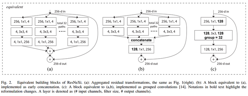 - (c) 1. 將每個通道中的第一層一道通道外,透過128個1x1x256 filter的卷積層,把feature maps下降到128個channel,在通道中才將128個channel分成32個group,每個group有4個channel,讀者可以自行想像,此處的實作意義也沒有發生變化。2. 在圖片表達上,作者把concatenate層放入第二層,並以group表示通道數量。