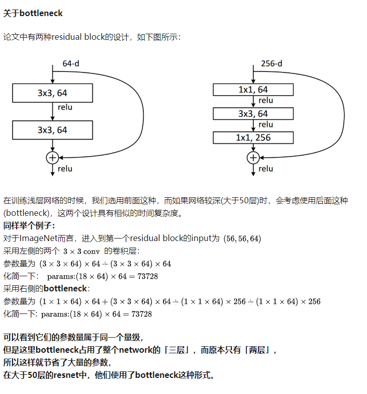 另外值得一提的是ResNet裡面使用的Bottleneck架構,由於ResNet成功讓模型可以被大大加深,參數與運算效率的議題又重新被納入考量,因此ResNet同時建議在超過50層的神經網絡引入Bottleneck架構。Bottleneck架構基本上就是在3x3的卷積層前後塞入1x1的卷積層,並藉此減少參數量以提升訓練效能,詳細的餐數量計算可以參考下圖(來源)。