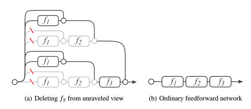 - Ensemble說: 基於2016年論文對於ResNet可以無損的傳播梯度給淺層網絡的證明,Ensemble說進一步說明,這樣的特性讓模型在更新每一層CNN權重時,永遠可以選擇保有上一層的特徵,這麼一來模型便在每一層便可以做兩個選擇,改變或是不改變上一層特徵,擴張了整個架構的彈性。而將這樣的選擇放入模型的每一層並視覺化後,便產出了下面這一張決策流程圖。(來源)