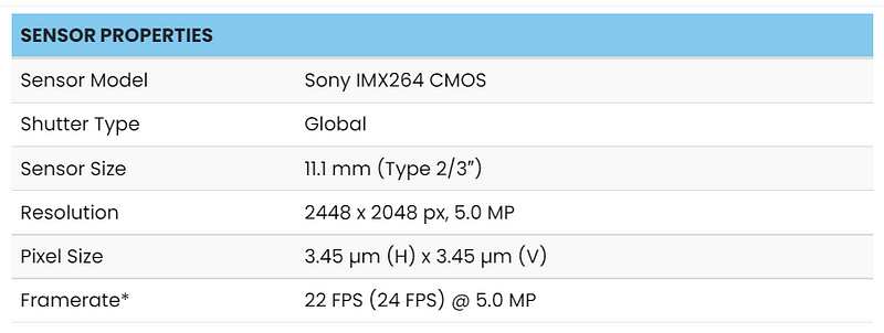 需別提醒的是,要拿來做測量的相機務必是定焦相機,焦距的變動亦會影響到其他參數如畸變參數與內方位參數,如此便無法進行量測。因此,在開始相關專案時必須確保使用的相機是定焦的鏡頭,並可以查得相機所使用的感光元件大小與像素大小。以Lucid工業相機為例,這邊隨機挑選了一台五百萬畫素的相機與4mm焦距的鏡頭。相機的規格如下圖,Sensor Size代表的是整個感光元件的大小,有些地方會用CCD Size表示,11.1mm代表的是感光元件對角線的長度。Pixel Size代表每一個像素的實際大小。一般來說,Sensor Size的長與寬除以像素的數量約會等於Pixel Size。