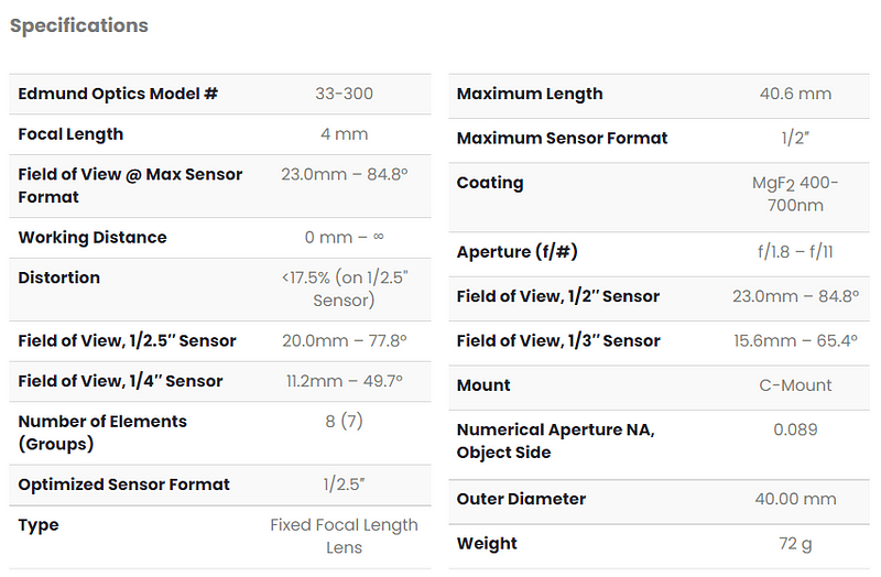 鏡頭的規格如下,Focal Length代表感光元件到透鏡中心的垂直距離。