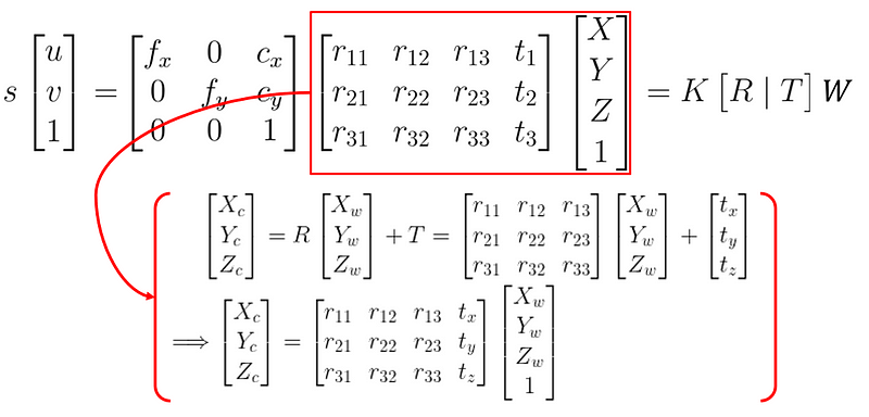 從上式來看,紅色框框內的計算就是將世界空間座標(Xw, Yw, Zw)轉換成相機空間座標(Xc, Yc, Zc),詳細的來說,又分為旋轉角的轉換(R)與位移(T),R是一個3x3的矩陣,實際意義則記錄了XYZ軸旋轉的角度,T的部分則是在相機空見座標系統中,相機空間座標中心與世界空間座標中心的位移量,所以將物點透過R轉換到相機空間後,再加上T位移,便可得到誤點在相機座標系統的位置,也就是下式中的(Xc, Yc, Zc)。