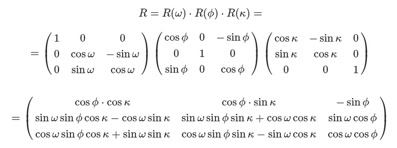 比較重要的是需要知道如何透過XYZ軸角度差,計算出轉換兩座標系統(世界and相機)的旋轉矩陣以方便Pinhole Camera Model的應用。以omega, phi, kappa系統為例,下面是將其轉換為旋轉矩陣的公式,其中omega, phi, kappa分別是XYZ軸的角度差,經過下面公式轉換後可以得到相應的旋轉矩陣,有線性代數座標系統轉換的基礎便很好理解其中意義,不過在這邊沒有相關基礎亦可以直接操作。