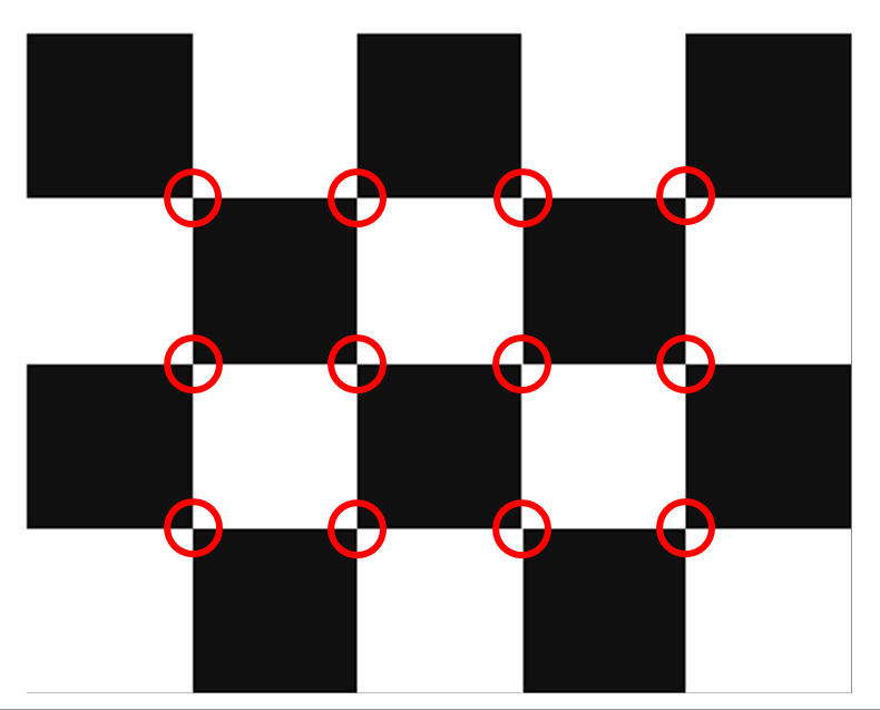 之後我們便可以得到上面這一張圖,圖中最上面那個很整齊的便是校正板的棋盤格點(見下圖),下面每一個紅點就是一張相片拍攝時相機所在的位置,位在相機前面一點點的平面是為了表示相機的旋轉角,並不是感光元件實際所在的位置,因為感光元件實際所在的位置會太靠近相機中心,幾乎就是黏再一起,這樣會無法辨識相機拍攝的旋轉角。