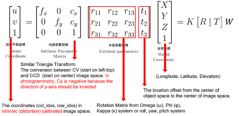 上式即是Pinhole Camera Model,可以用來計算3D物點投影到相片上的像素點,要完成這樣的投影轉換主要需取得畸變參數(Distortion Coefficients,沒有出現上面的圖片或式子中)、內方位參數(Intrinsic Parameters)、外方位參數(Extrinsic Parameters)與物點的世界空間座標(World Coordinate),以下逐一介紹: