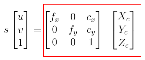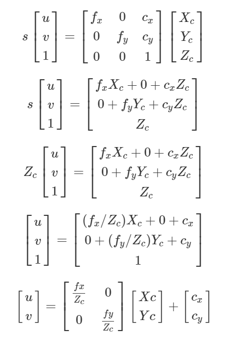 最後我們再回過頭來看原式,等號的左手邊u, v旁邊還乘一個s,等號右手邊乘開來X軸會等於fx*Xc+0+cx*Zc、Y軸會等於0+fy*Yc+cy*Zc、Z軸會等於Zc,但左手邊我們需取得的Z軸是1,所以將XYZ軸全部除以Zc,便可成功建立等號。