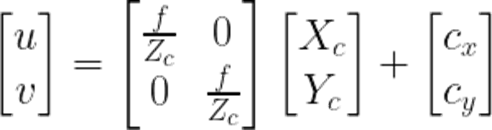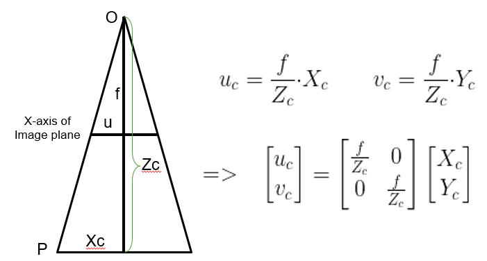 我們把相似三角形投影在XZ平面上的相似三角形解剖來看可以得到下圖,P點在相機空間座標中X軸座標為Xc、Y軸座標為Yc,其投影在相片上的Z軸座標為f,那麼X軸座標就會等於(fx/Zc)*Xc。如果套用在YZ平面上面即可以得到,Y軸座標等於(fy/Zc)*Yc。下面最右下式將其改寫為矩陣相乘的形式,不過得到的結果會是一致的。