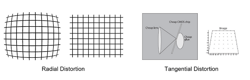主要用來表示弧面相機鏡頭所導致相片邊緣的像素扭曲的情況,主要有下圖中兩種類型的畸變。上面的圖片或式子中沒有顯示相關的參數,主要是因為他們假設畸變已經被校正,但是這仍然是不能被忽略的步驟,不過簡單的畸變校正可以用OpenCV來完成,本文最後一位提供Python與OpenCV的程式碼,校正算法跟參數結構這裡就不說明了。