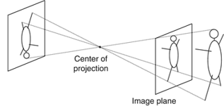 上圖中紫色的線段可以組成兩個三角形,並互為相似三角形。由於上一步驟的計算,已知P點在相機空間座標為(Xc, Yc, Zc),透過相似三角形的計算可以得知其在相機空間座標中P點投影至相片上的位置(uc, vc, f),此處的Z軸必定是焦距(focal length,上圖中的F),因為是在相機空間座標中,所以uc與vc中的c是Camera的縮寫。