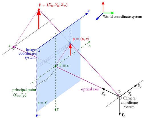 相片平面座標: 就是下圖Imaeg Coordinate System,也就是感光元件所在的位置,因為相片是一個2D平面,僅有X軸與Y軸,其以像素為單位,相片由左到右為X軸、由上到下為Y軸。這裡須注意,這裡的XY軸比較像是OpenCV的設定,OpenCV的第一的維度是橫向的Column、第二個維度是直向的Row,Numpy的第一的維度是直向的Row、第二個維度是橫向的Column。